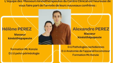 Arrivée de Madame Hélène PEREZ et de Monsieur Alexandre PEREZ, Masseurs kinésithérapeutes
