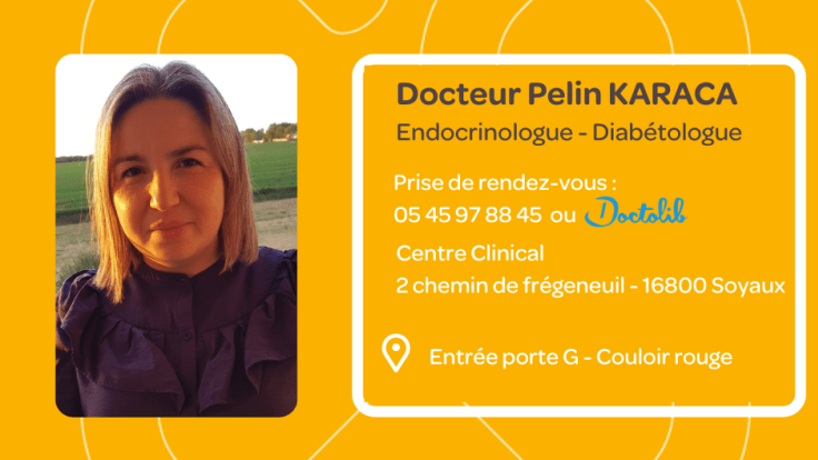 Prise de rendez-vous : https://www.doctolib.fr/endocrinologue/soyaux/pelin-karaca ou par téléphone au : 05 45 97 88 45
