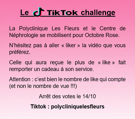 Vous pouvez participer au concours en allant "LIKER" la vidéo que vous préférez via le lien : https://www.tiktok.com/@polycliniquelesfleurs?_t=8WNqxir8uO6&_r=1