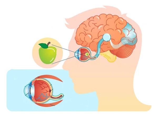 Si l'on souhaite illustrer le mécanisme de la vue, il peut être comparé à celui d'un appareil photo. La pupille joue le rôle du diaphragme, le cristallin celui de la mise au point et la rétine, de la pellicule. Afin de voir, l'œil envoie des influx nerveux au cerveau via le nerf optique. Les rayons de lumière du soleil, des ampoules, mais aussi ceux reflétés sur les objets, traversent l'œil par la cornée. Ils sont ensuite ajustés par l'iris et traverse le cristallin et le corps vitré pour arriver à la rétine. Les cônes et les bâtonnets réceptionnent alors des rayons lumineux et, en quelques sortes, les traduisent en information visuelle. L'information visuelle traduite par les photorécepteurs est alors transformée en signal électrique envoyé au cerveau par le nerf optique et ainsi former l'image que l'on voit.