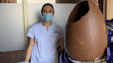 Un œuf en chocolat géant a été exposé pendant 15j en salle d’attente, puis a été ouvert quelques jours avant Pâques.