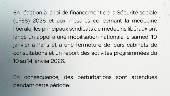 En réaction à la loi de financement de la Sécurité sociale (LFSS) 2026 et aux mesures concernant la médecine libérale, les principaux syndicats de médecins libéraux ont lancé un appel à une mobilisation nationale le samedi 10 janvier à Paris et à une fermeture de leurs cabinets de consultations et un report des activités programmées du 10 au 14 janvier 2026.