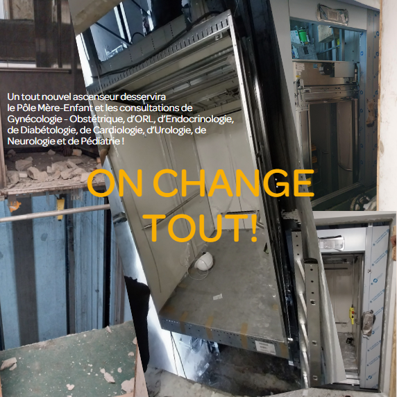 Très bientôt, un tout nouvel ascenseur desservira le Pôle Mère-Enfant ainsi que plusieurs cabinets médicaux : Gynécologie -Obstétrique, ORL, Endocrinologie, Diabétologie, Cardiologie, Urologie, Neurologie et Pédiatrie.