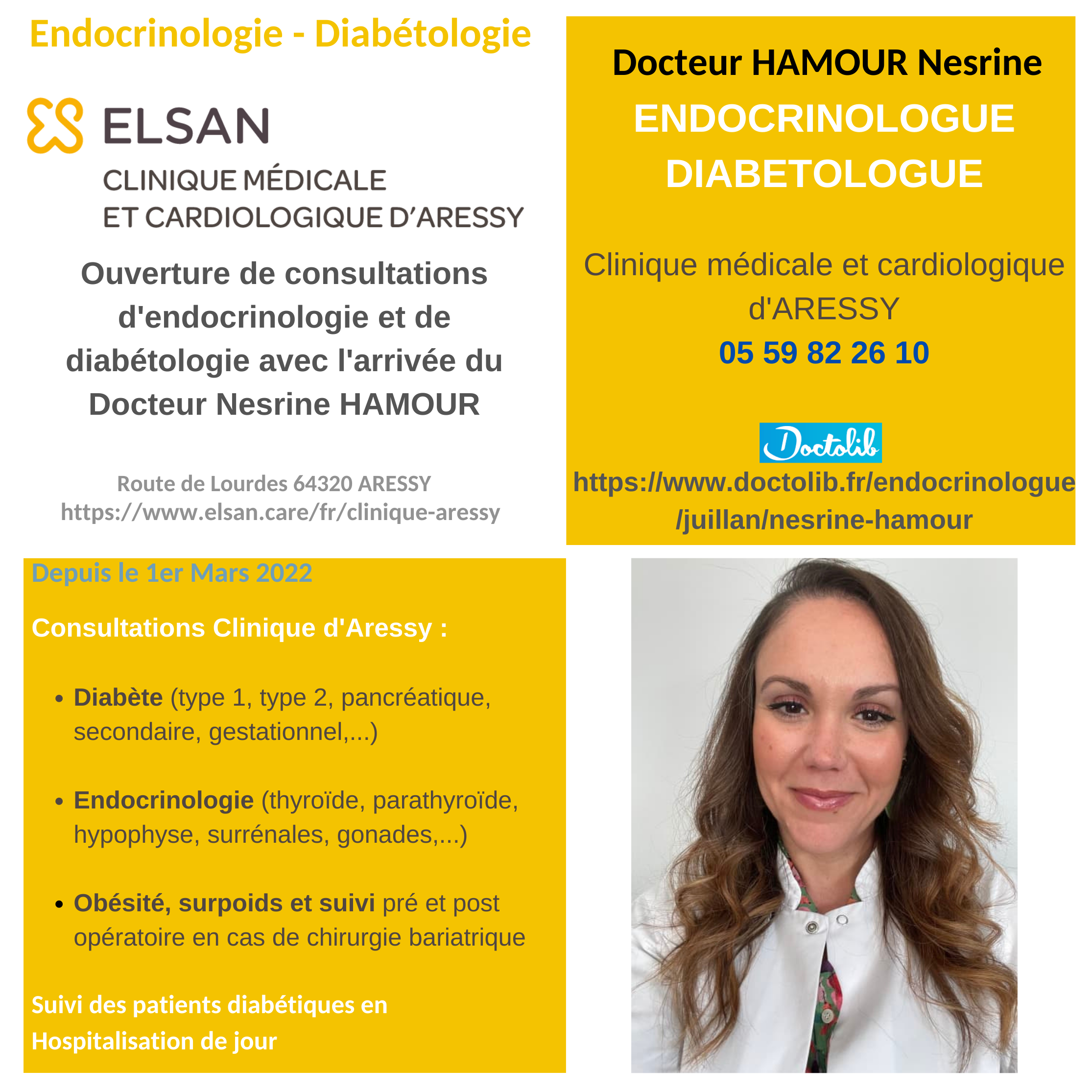 Le docteur Nesrine Hamour, endocrinologue-diabétologue consulte sur la clinique d’Aressy depuis le 1er mars 2022 et ouvrira le 13 avril 2022 des consultations avancées sur la Clinique de l’Ormeau à Tarbes.
