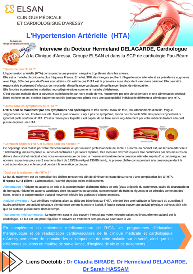 A l'occasion de la journée nationale contre l'Hypertension Artérielle, le docteur Hermeland DELAGARDE, #cardiologue à la Clinique Médicale et Cardiologique d'Aressy - ELSAN répond à vos interrogations sur l'HTA : Quels sont les symptômes ? les moyens de dépistage ? Comment traiter cette maladie chronique qui touche, en France, un adulte sur trois ?