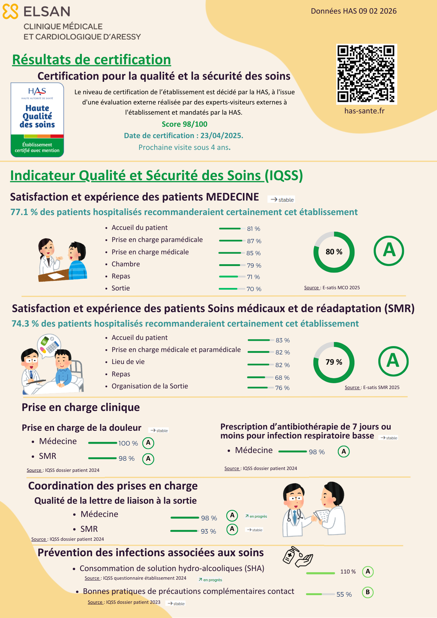 📣 Nous sommes fiers de vous partager les résultats 2025 des #Indicateurs Qualité et Sécurité des Soins qui viennent d'être publiés par la Haute Autorité de Santé ! 🔎 https://www.has-sante.fr/jcms/2234_FicheEtablissement/fr/clinique-medicale-cardiologique-aressy
