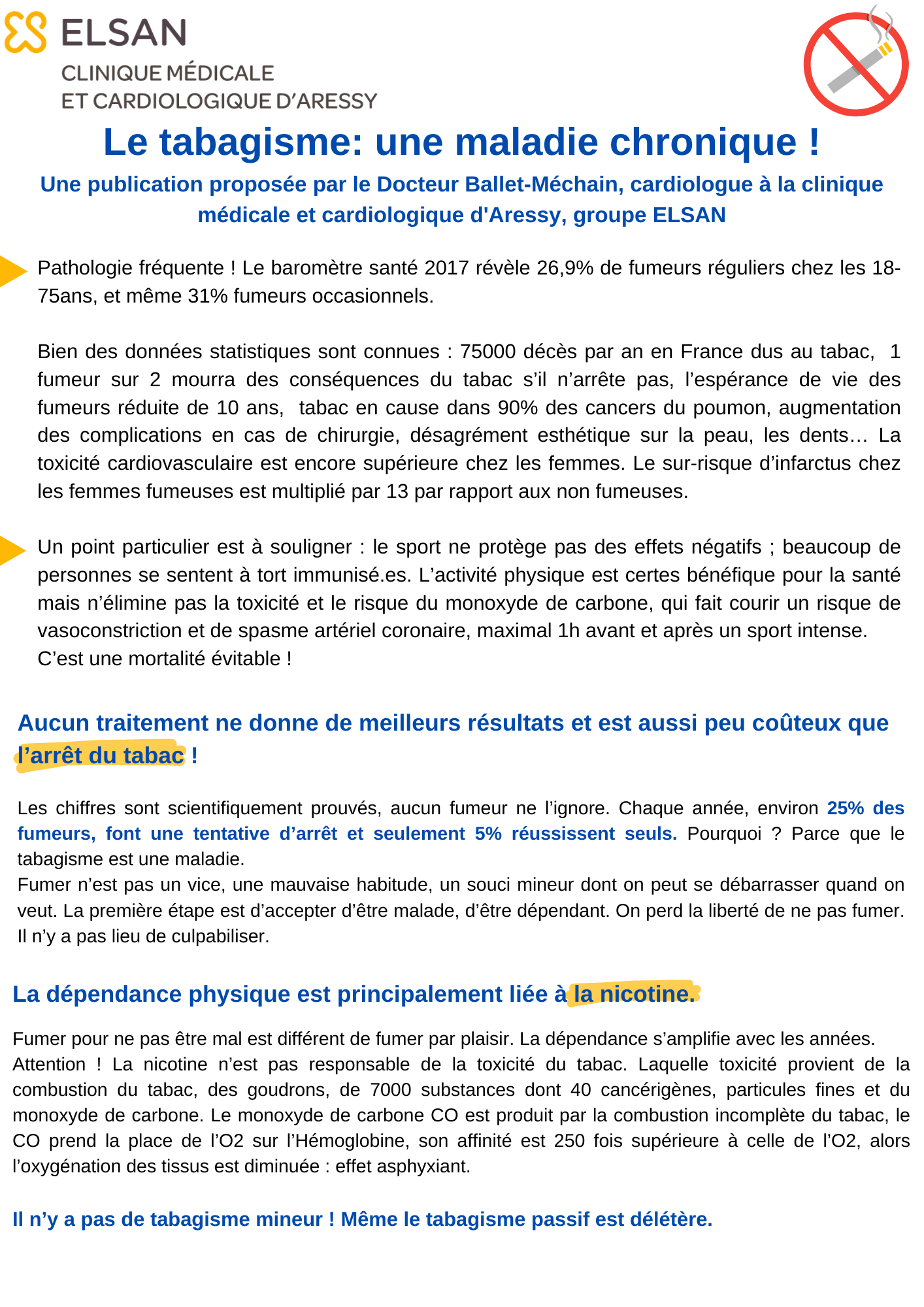 A l'occasion de la journée mondiale sans tabac qui s'est déroulée hier, le Docteur Marianne BALLET MECHAIN, cardiologue au sein de la Clinique Médicale et Cardiologique d'Aressy, vous partage une publication sur le #tabagisme, ses risques et ses traitements ! ?