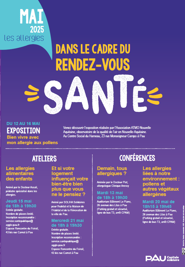 📢 RDV de la Santé organisé par la ville de Pau du 12 au 21 mai 2025 ! Thème de ce mois de mai : Les ALLERGIES. 🗣️