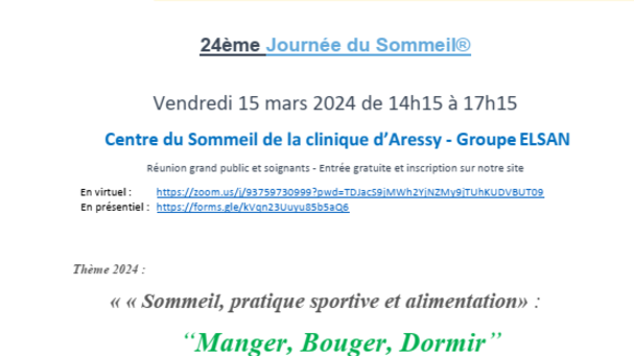 Le centre du sommeil de la Clinique médicale et cardiologique d'Aressy - Groupe Elsan organise des Conférences dans le cadre de la journée du sommeil le vendredi 15 mars 2024.