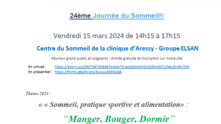 Le centre du sommeil de la Clinique médicale et cardiologique d'Aressy - Groupe Elsan organise des Conférences dans le cadre de la journée du sommeil le vendredi 15 mars 2024.