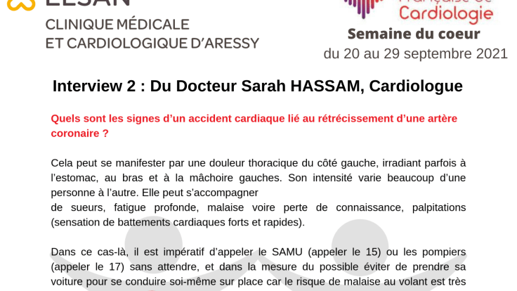 Réponse du Docteur Sarah Hassam, Cardiologue au sein de la clinique médicale et cardiologique d'Aressy, Groupe Elsan.