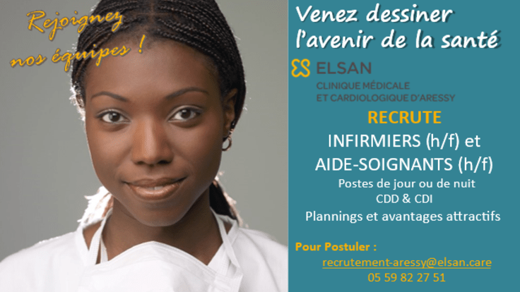 La clinique d'Aressy, située à 5 minutes de Pau, RECRUTE des INFIRMIER(E)S et AIDE-SOIGNANT(E)S, h/f. Postes de Jour et postes de nuit. CDI et CDD.