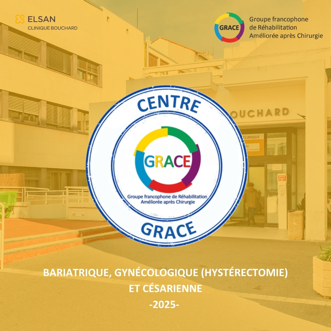 Cette année encore, la Clinique Bouchard - ELSAN est fière d'annoncer l'obtention du prestigieux LABEL GRACE (Groupe Francophone de Réhabilitation Améliorée après Chirurgie). Cette distinction concerne les domaines de la chirurgie bariatrique, gynécologique (hystérectomie) et les césariennes.