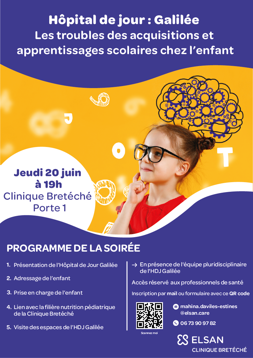 Les équipes soignantes de l'Hopital de jour "Galilée" proposeront d'aborder le Jeudi 20 juin 2024 les troubles des acquisitions et apprentissages chez l'enfant.