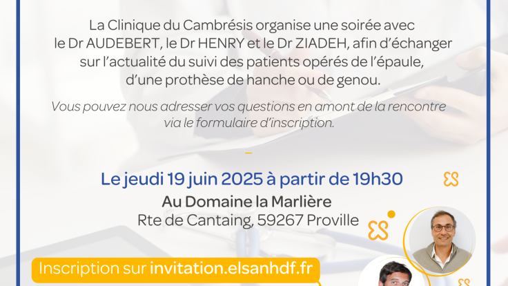 La Clinique du Cambrésis organise une soirée avec le Dr AUDEBERT, le Dr HENRY et le Dr ZIADEH, afin d’échanger sur l’actualité du suivi des patients opérés de l’épaule, d’une prothèse de hanche ou de genou.