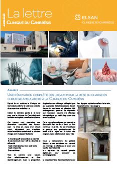 La Clinique du Cambrésis, autorisée par l’Agence Régionale de Santé (ARS) Hauts-de-France, regroupe 19 médecins spécialistes et une équipe de 50 personnes. Elle possède 46 lits et postes d’hospitalisation conventionnelle et ambulatoire. Vous trouverez sur ce site toutes les informations nécessaires à la préparation de votre venue dans notre établissement. La Clinique du Cambrésis est un établissement ELSAN.
