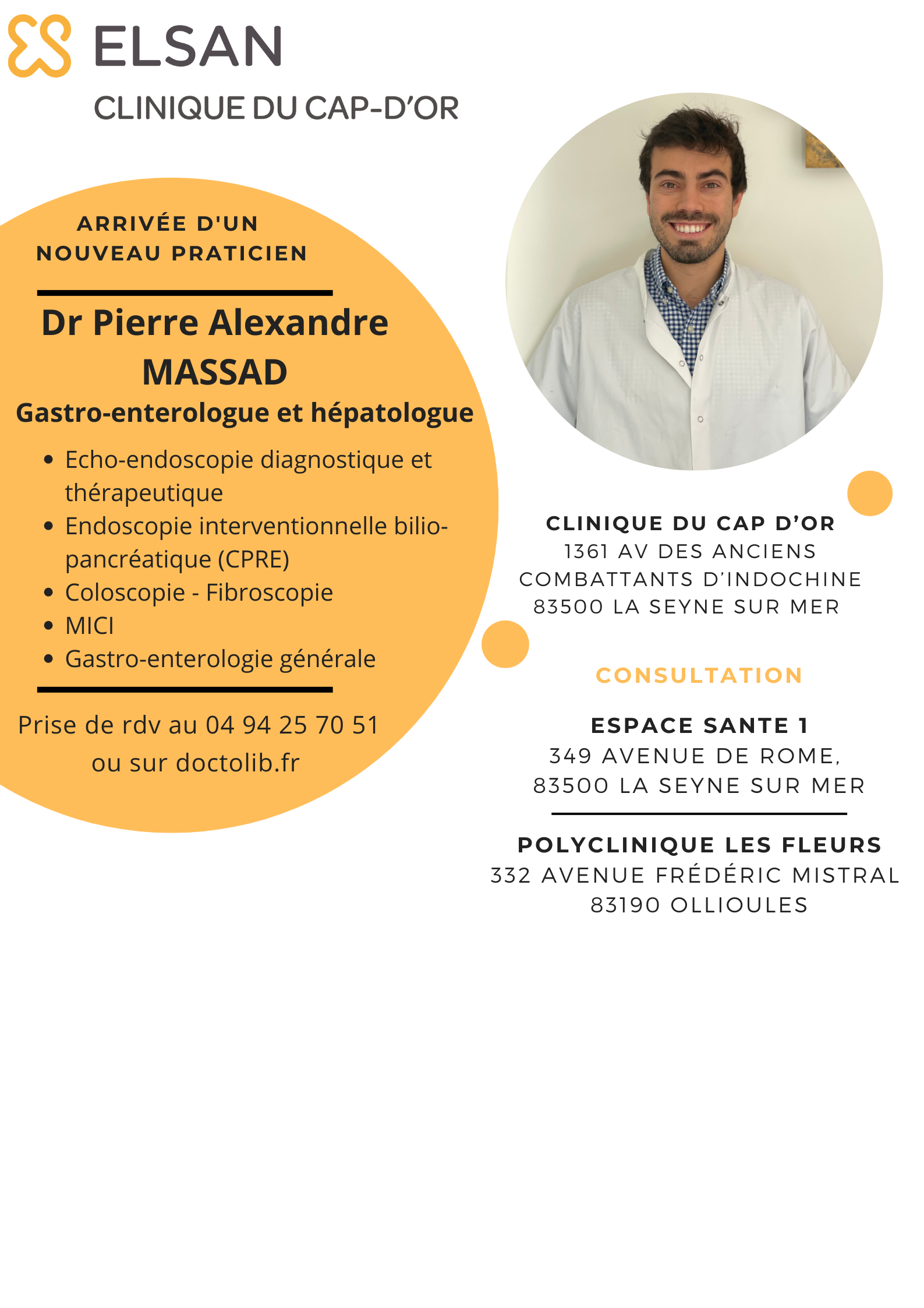 Nous sommes ravis de vous annoncer l'installation du 𝐃𝐫 𝐏𝐢𝐞𝐫𝐫𝐞 𝐀𝐥𝐞𝐱𝐚𝐧𝐝𝐫𝐞 𝐌𝐀𝐒𝐒𝐀𝐃, Gastroentérologue, qui vient renforcer l'équipe des Dr Jean-Luc CAUMES et Dr François ROMAND sur la Clinique du Cap d'or
