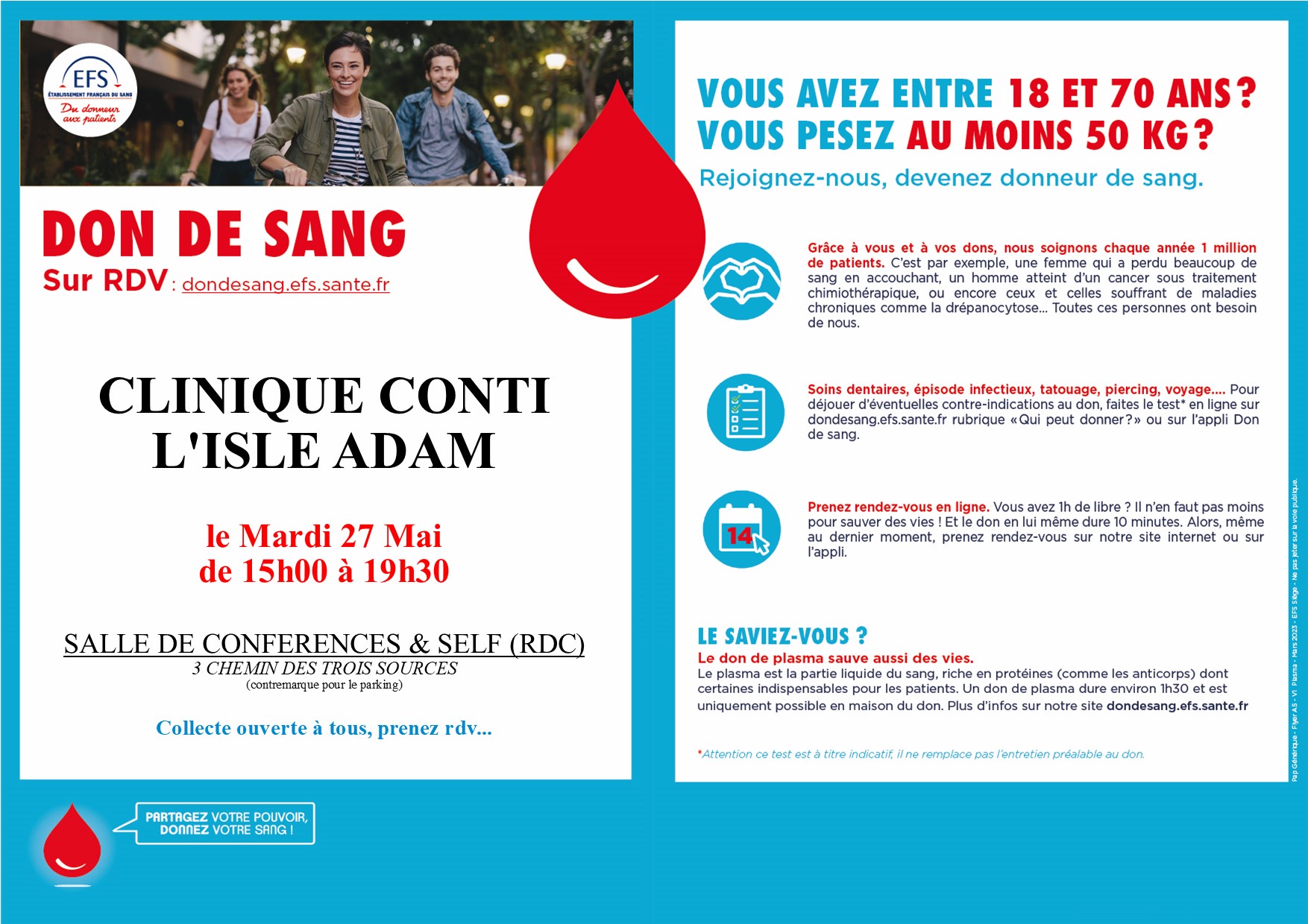 , de 15h à 19h30, notre clinique organise une journée spéciale Don du Sang, en partenariat avec l’Établissement Français du Sang (EFS).