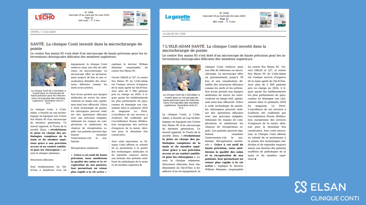 Nous sommes fiers d'annoncer que notre service SOS Mains a récemment acquis un microscope de haute précision, renforçant ainsi notre capacité à traiter les urgences de la main avec une précision inégalée. Cette avancée technologique a été mise en lumière par la presse régionale, soulignant notre engagement constant envers l'excellence médicale.