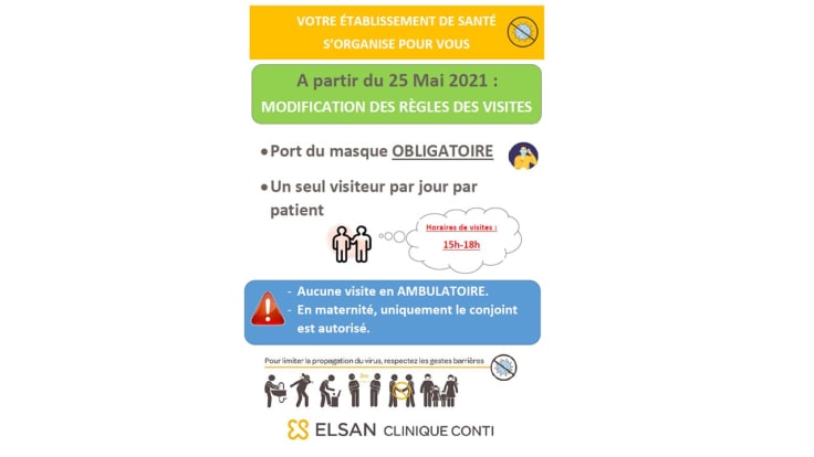 UN seul visiteur par jour et par patient (en maternité: uniquement le conjoint et pas de visite en ambulatoire)