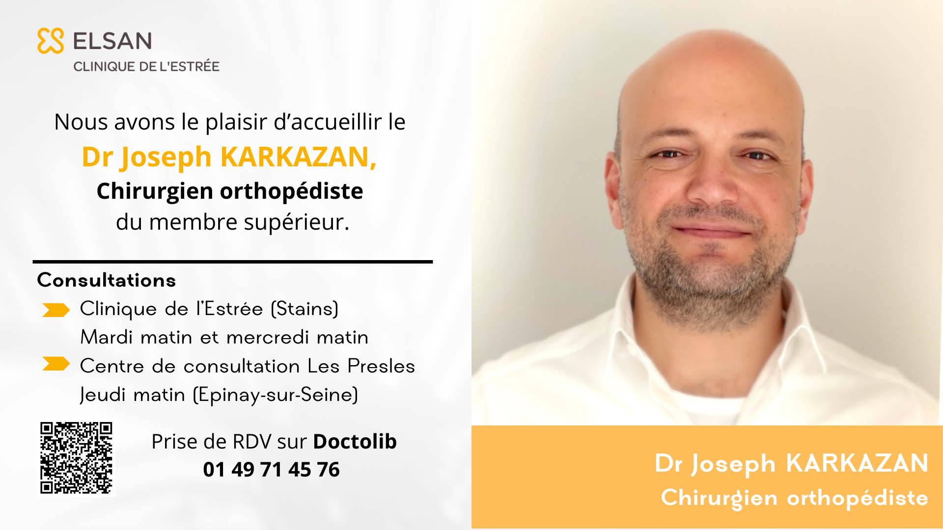 💉 La Clinique de l'Estrée a le plaisir d'accueillir le 𝐃𝐫 𝐉𝐨𝐬𝐞𝐩𝐡 𝐊𝐀𝐑𝐊𝐀𝐙𝐀𝐍, Chirurgien orthopédiste du membre supérieur.