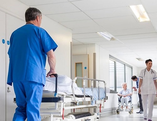 J’arrive dans la chambre du patient, je me présente et je lui pose des questions sur son identité (identitovigilance), sur le port de bijoux et d’appareils dentaires ou auditifs. Je lui pose aussi des questions de confort (s’il a besoin d’aller au toilette avant l’intervention par exemple). Je récupère les documents dont il y a besoin au bloc opératoire, en rapport avec l’intervention (radio, scanner, IRM, échographies). Ensuite je transporte le patient. Maintenant le patient part debout au bloc la plupart du temps mais il peut également être descendu en fauteuil ou en lit selon l’état physique du patient et l’intervention qu’il va subir. Les infirmiers nous donnent les consignes pour que l’on le sache quel mode de transport choisir et c’est aussi écrit sur l’enveloppe du dossier médical qui descend au bloc avec le patient. Donc je descends le patient au bloc.