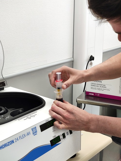 Premièrement, une infirmière réalise une prise de sang au patient. Ce sang est ensuite placé dans la centrifugeuse pour séparer ses composants et n’extraire que le plasma riche en plaquettes. Une fois le processus terminé, le médecin prélève le plasma dans la seringue prévue à cet effet et réalise l’injection, sans aucune transformation du produit. Le protocole consiste à réaliser une à trois injections de PRP, sans anesthésie locale (pour ne pas diminuer l’efficacité du traitement).