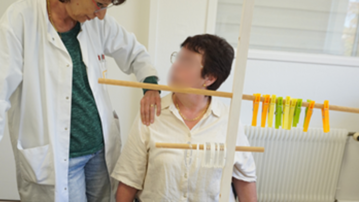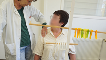 Patricia prend également en charge les premières séances des patients opérés de suture de la coiffe des rotateurs, après un mois d’immobilisation. Les mouvements sont alors lents, précis, parfois très exigeants : lever simplement l’avant-bras ou accrocher des anneaux devient un véritable défi. Elle guide le patient pas à pas, avant le relais avec les kinésithérapeutes ou les enseignants APA.
