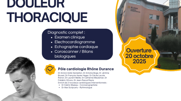 À partir du 20 octobre 2025, la Clinique Rhône Durance ELSAN franchit une nouvelle étape dans l'excellence de sa prise en charge cardiologique avec l'ouverture d'une Unité de Douleur Thoracique dédiée. Cette nouvelle unité permet d'offrir aux patients du Vaucluse une réponse rapide, complète et spécialisée face aux douleurs thoraciques nécessitant une évaluation urgente.