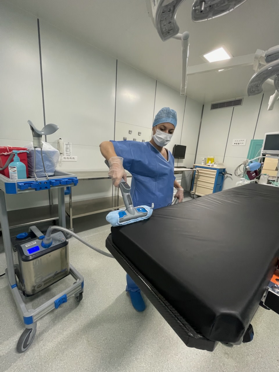 Totalement novateur à l’époque en établissement de soins, la Clinique a pris le pari avec son prestataire Sodexo, de tester le bio-nettoyage à la vapeur grâce au dispositif vapeur de Sanivap. Cette technique fournit une puissance de nettoyage à toute épreuve : il produit une vapeur à très haute température, qui pénètre dans les moindres recoins et assure donc une parfaite asepsie.