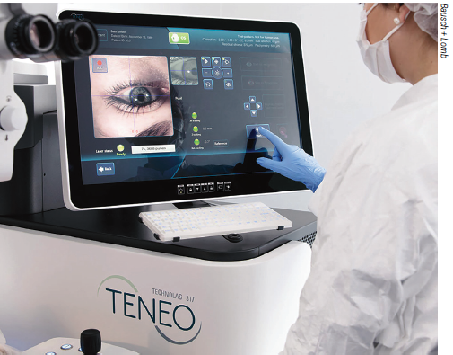 2. Sculpture de la cornée : par le Laser excimer TENEOMC 317 Modèle 2 TECHNOLASMD, ce dernier va sculpter la cornée pour corriger les défauts de la vision du patient. A la fin de cette dernière application laser, le capot est remis en place soigneusement. Pendant l’intervention, l’oeil est maintenu ouvert délicatement par un écarteur. Toute la procédure laser est automatisée et sous le contrôle de logiciels et du chirurgien, hormis le soulèvement et le repositionnement du capot qui nécessitent l’intervention de la main du chirurgien.