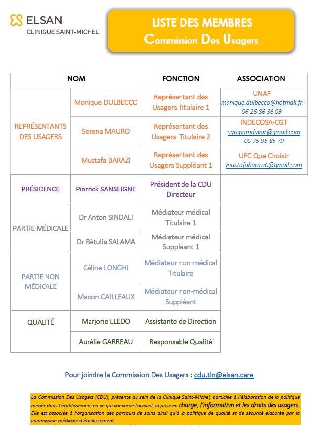 Vous pouvez également saisir la Commission des Usagers (CDU) afin de rencontrer un médiateur. Vous pourrez vous faire assister d'un de nos Représentants des Usagers (info)