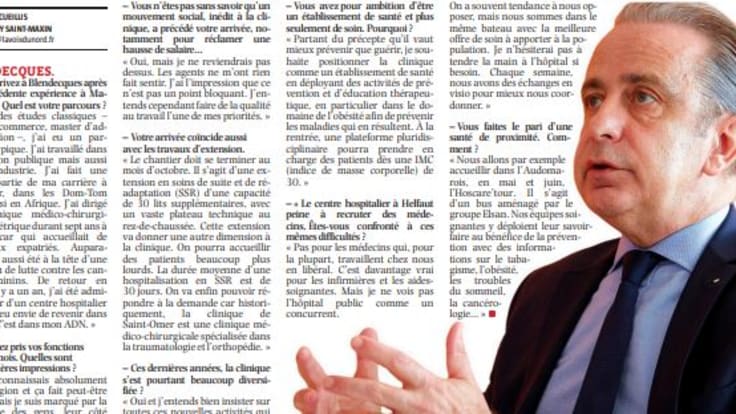 « Après des études classiques - école de commerce, master d'administration-, j'ai eu un parcours atypique. J'ai travaillé dans la fonction publique mais aussi dans l'industrie. J'ai fait une grande partie de ma carrière à l'étranger, dans les Dom-Tom mais aussi en Afrique. J'ai dirigé une clinique médico-chirurgicale-obstétrique durant sept ans à Madagascar qui accueillait de nombreux expatriés. Auparavant, j'ai aussi été à la tête d'une fondation de lutte contre les cancers féminins. De retour en France il y a un an, j'ai été administrateur d'un centre hospitalier mais j'ai eu envie de revenir dans le privé. C'est dans mon ADN. » [...]