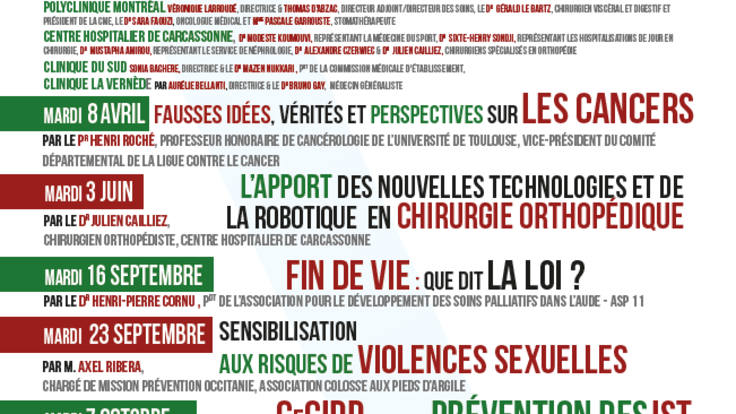 Nous avons le plaisir de vous annoncer la participation de la Clinique du Sud aux Mardis de la Santé, un cycle de conférences organisé par la Ville de Carcassonne pour sensibiliser et informer sur des thématiques de santé publique.