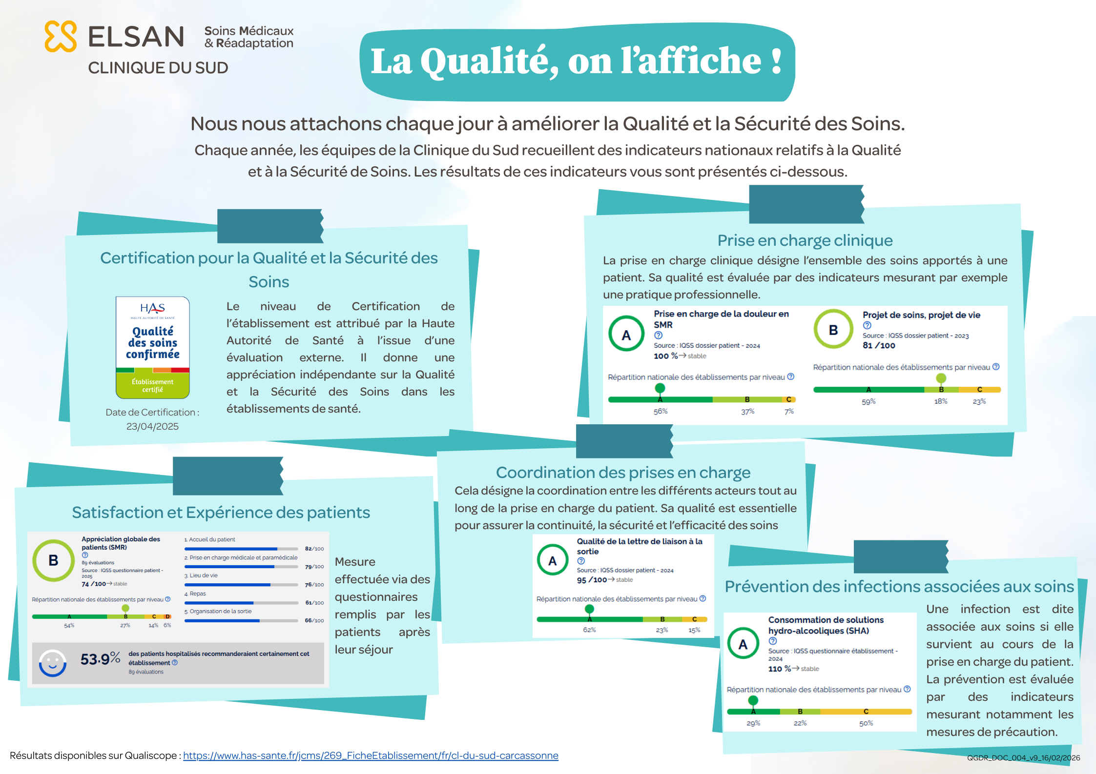 Les résultats détaillés des indicateurs Qualité & Sécurité des Soins (IQSS) de la Clinique du Sud sont présentés sur l’affiche jointe.