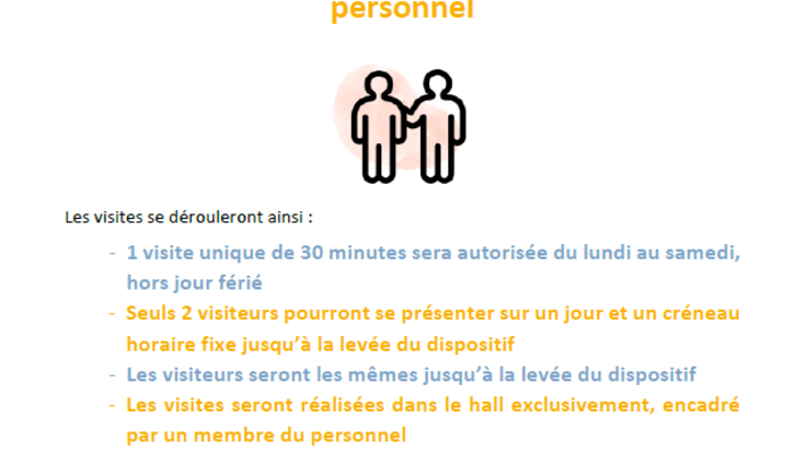 Devant l’aggravation de la situation sanitaire, la Direction modifie les règles d’organisation des visites à compter du lundi 18/01/2021, et ce jusqu’à nouvel ordre.