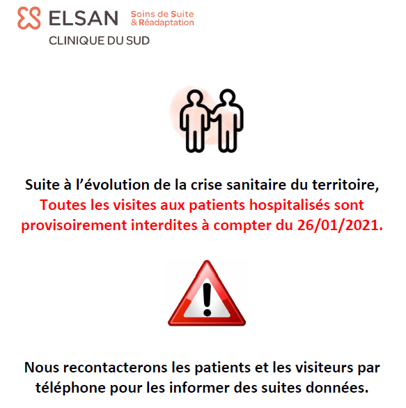 Toutes les visites aux patients hospitalisés sont provisoirement interdites à compter du 26/01/2021.
