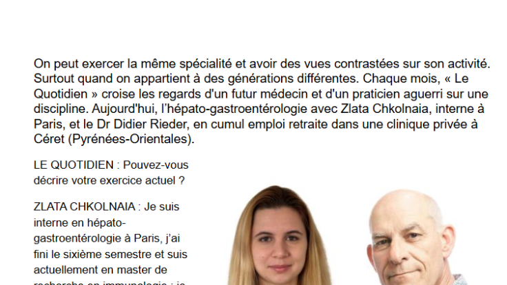 Le Quotidien du Médecin consacre un article à l’hépato-gastroentérologie, en croisant deux approches complémentaires : celle du Dr Didier Rieder, médecin expérimenté exerçant à la Clinique du Vallespir depuis 2019, et celle de Zlata Chkolnaia, interne en médecine à Paris.