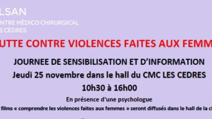 Dans le cadre de la journée internationale « Lutte contre les violences faites aux femmes » qui a lieu le jeudi 25 novembre, Le CMC LES CEDRES, un établissement ELSAN, organise une journée de sensibilisation et d’information dédiée à ce sujet sensible :