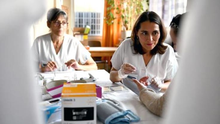 « Sur place, les gens sont avertis par les annonces faites dans les locaux d'Emmaüs, et ils viennent souvent nous voir après avoir fait leurs achats », précise Delphine Auboiroux, infirmière, qui les reçoit, avec sa collègue, à l'étage dans un cabinet improvisé. Les deux professionnelles mesurent le taux de glycémie et de cholestérol, mais aussi le tour de taille, le poids, la tension « pour définir le profil de la personne. On repère notamment les risques cardiovasculaires. » Puis elles les questionnent sur leur alimentation, leurs exercices physiques pour leur donner des conseils.