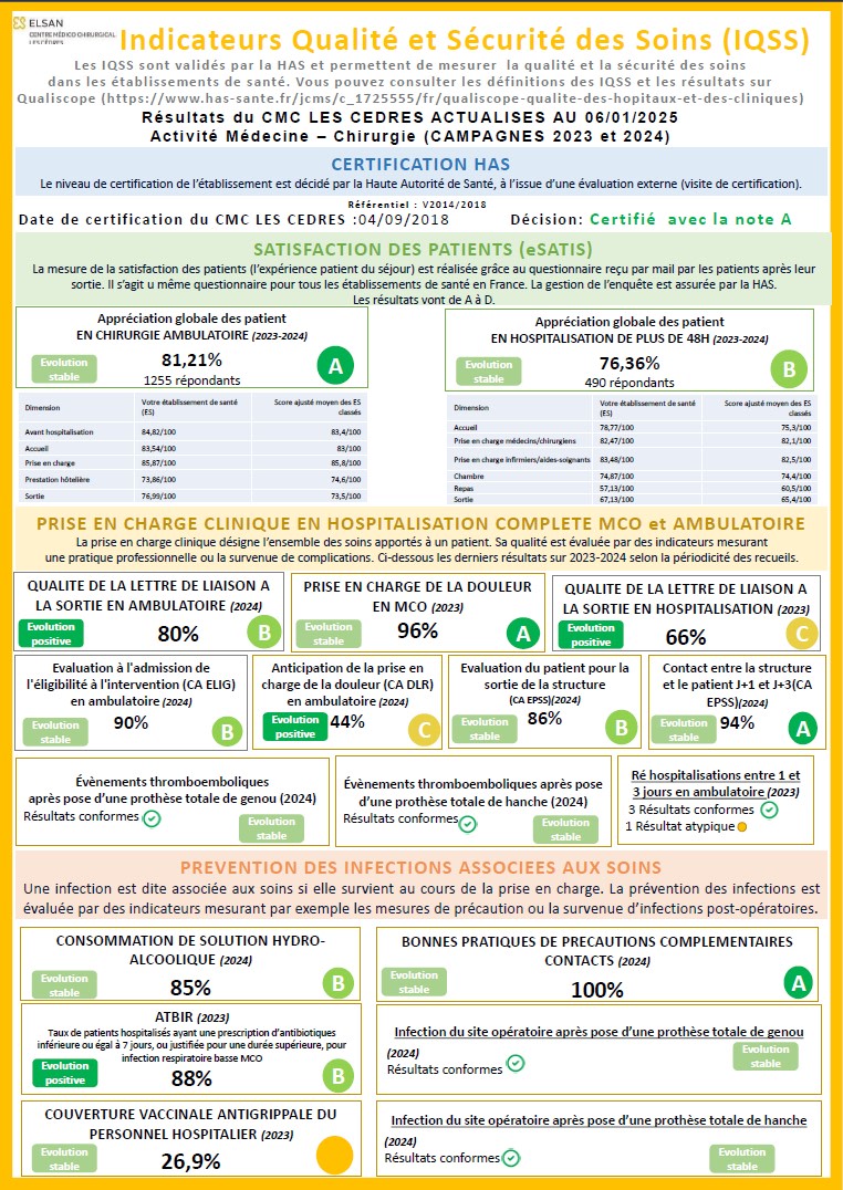 Après avoir brillamment obtenu la note de A lors de ces deux précédentes itérations de certification HAS en 2013 (HAS V2010) puis en 2018 (HAS V2014), le CMC Les Cèdres porte le souhait de récidiver avec l’obtention de bons résultats pour sa prochaine épreuve qui aura lieu en 2024 (HAS V2020).