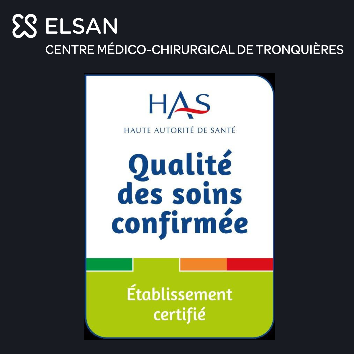 📝 Le Centre Médico-Chirurgical de Tronquières - ELSAN, établissement ELSAN à Aurillac, a obtenu la certification décernée par la Haute Autorité de Santé avec la mention "𝐐𝐮𝐚𝐥𝐢𝐭é 𝐝𝐞𝐬 𝐬𝐨𝐢𝐧𝐬 𝐜𝐨𝐧𝐟𝐢𝐫𝐦é𝐞".