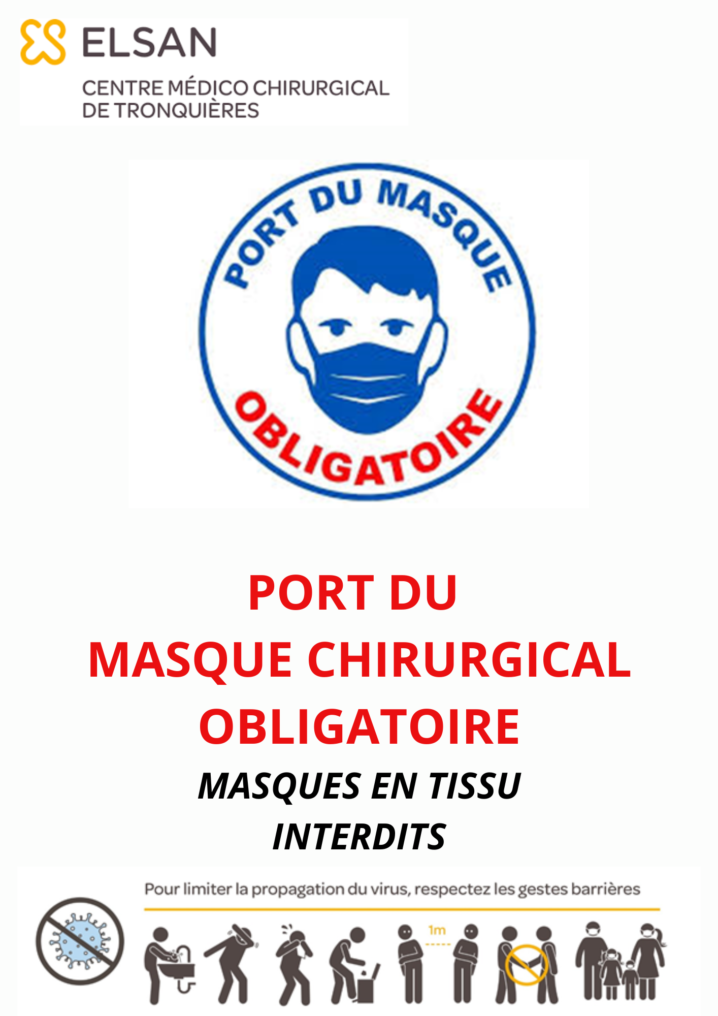 A compter du jeudi 19 octobre 2023, le port du masque chirurgical est obligatoire dans l’établissement du Centre médico-chirurgical de Tronquières. Les Masques en tissus sont strictement interdits.