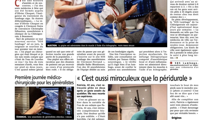 SOS Lumbago est un parcours proposé à l'initiative du groupe Anesthésie Clermont-Ferrand à l'Hôpital Privé la Châtaigneraie - ELSAN en complément de la prise en charge par les médecins et kinésithérapeutes en ville.