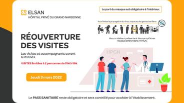 Coronavirus Vie des établissements/salariés Hôpital Privé du Grand Narbonne 03/03/2022 Réouverture des visites : Visiteurs et Accompagnateurs autorisés Vous avez aimé cette page ? Partagez-la !