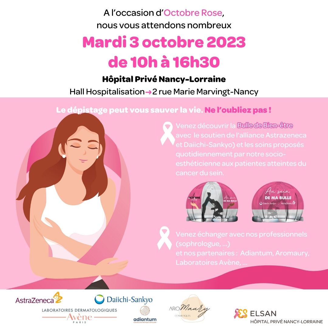 Nous vous attendons nombreuses le mardi 3 octobre de 10h à 16h30, Hall Hospitalisation de l' Hôpital privé Nancy-Lorraine-ELSAN pour découvrir la bulle de bien-être AstraZeneca( avec le soutien de Daiichi-Sankyo), les soins socio-esthétiques proposés aux patientes atteinte d'un cancer, rencontrer nos partenaires ( Aromaury, Adiantum centre capillaire) et échanger avec nos professionnels et notamment notre #sophrologue .