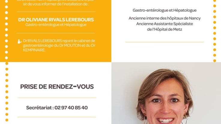 Bienvenue Hôpital Privé Océane 08/01/2021 Arrivée Dr Oliviane RIVALS LEREBOURS, Gastro-entérologue et Hépatologue Vous avez aimé cette page ? Partagez-la !