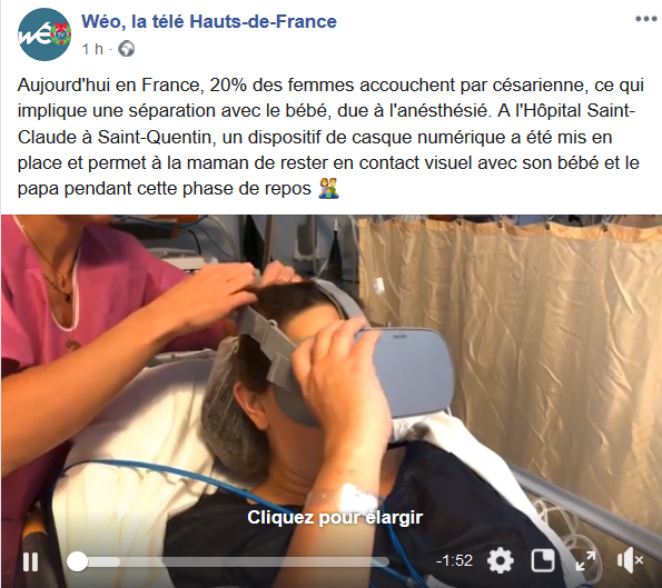 Un casque numérique pour garder le contact avec bébé après césarienne. Aujourd'hui en France, 20% des femmes accouchent par césarienne, ce qui implique une séparation avec le bébé, due à l'anesthésie. A l'Hôpital Saint-Claude à Saint-Quentin, un dispositif de casque numérique a été mis en place et permet à la maman de rester en contact visuel avec son bébé et le papa pendant cette phase de repos