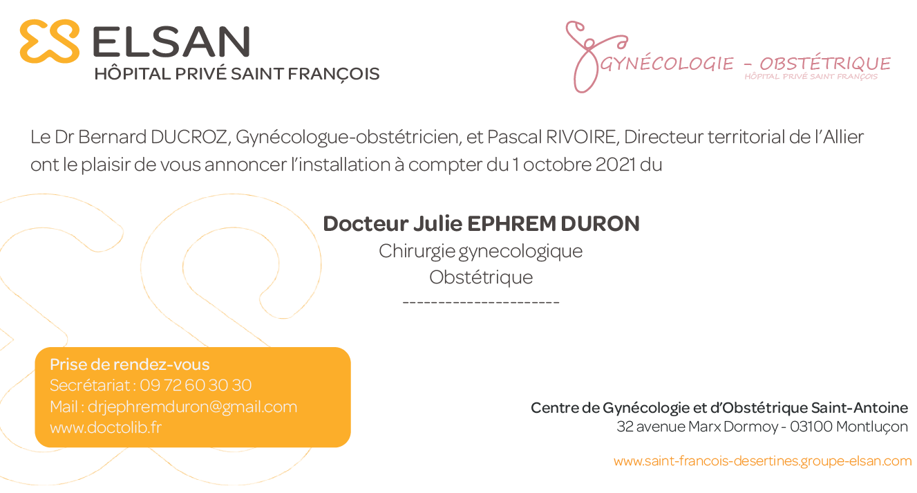 Le Dr Julie Ephrem Duron exerce une activité chirurgicale gynécologique et obstétrique à l'hôpital privé Saint François.