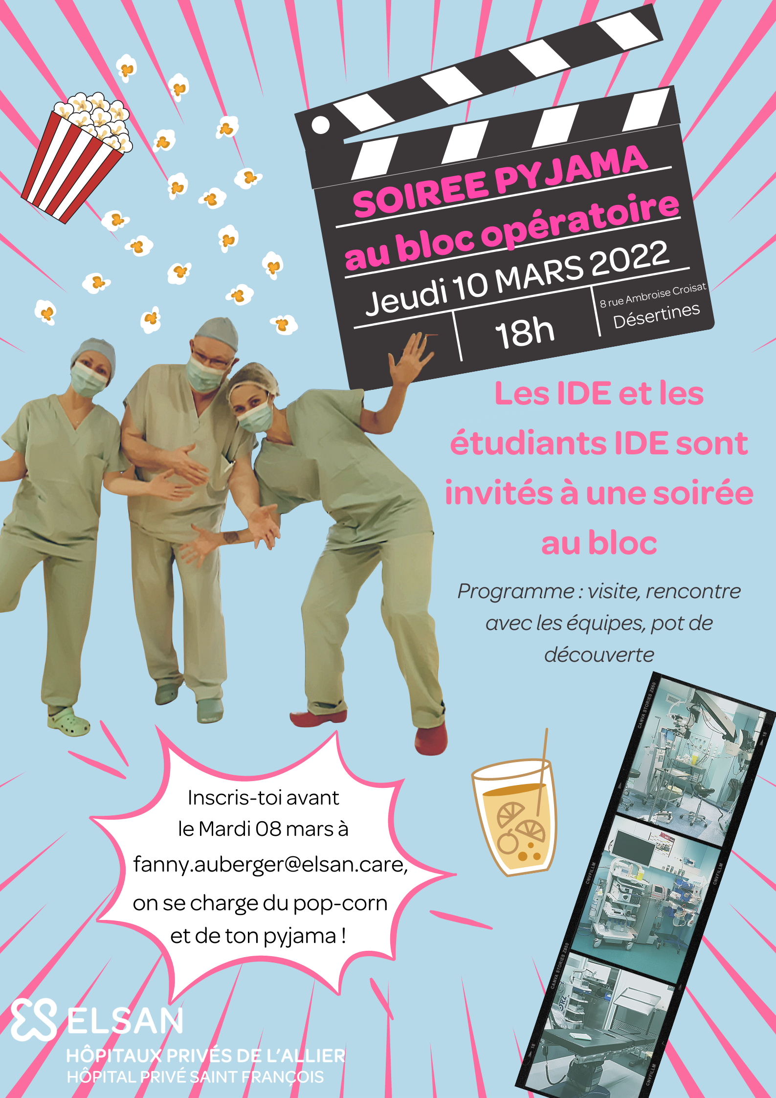 Vous êtes IDE ou étudiants IDE ? Venez découvrir le fonctionnement du bloc opératoire de l'Hôpital Privé Saint François à Montluçon lors d'une soirée pyjama qui se déroulera le Jeudi 10 Mars 📅